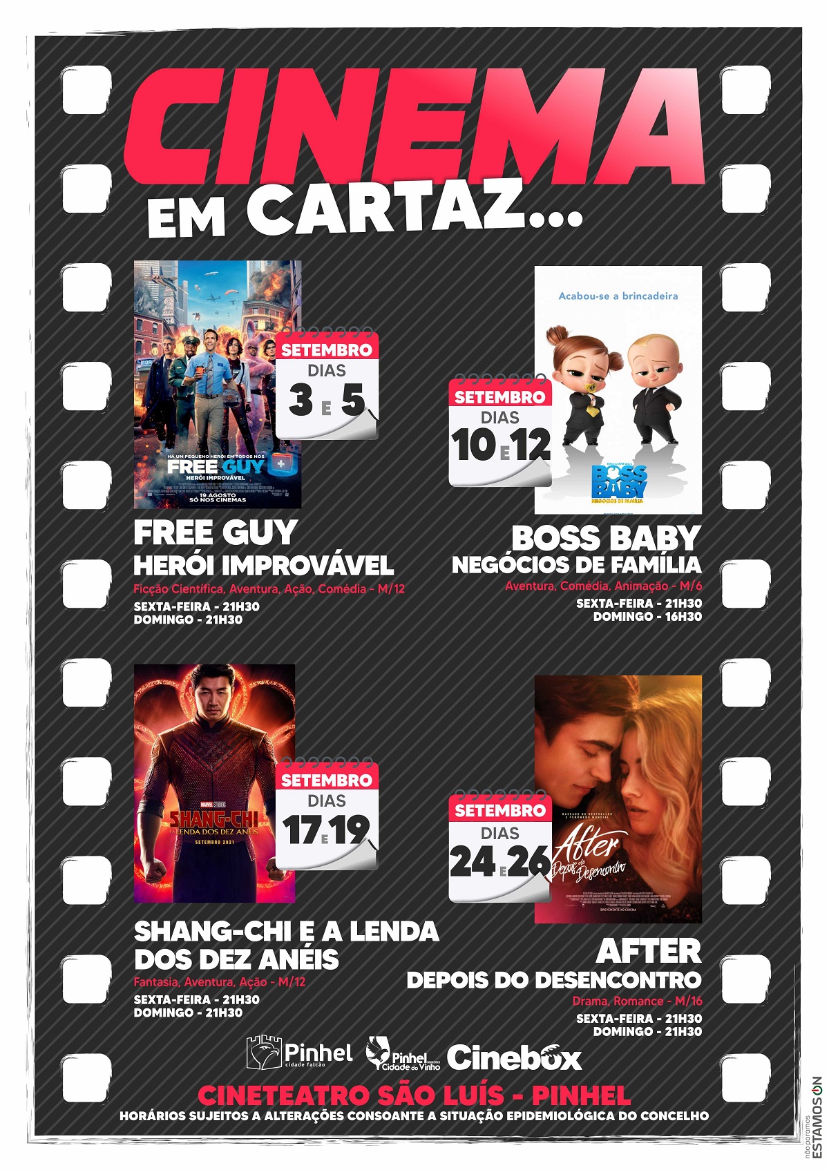 Aqui fica a programação de cinema agendada para o mês de setembro, no Município de Pinhel, sendo os filmes exibidos no Cineteatro São Luís, em Pinhel, nos dias e horários abaixo indicados.