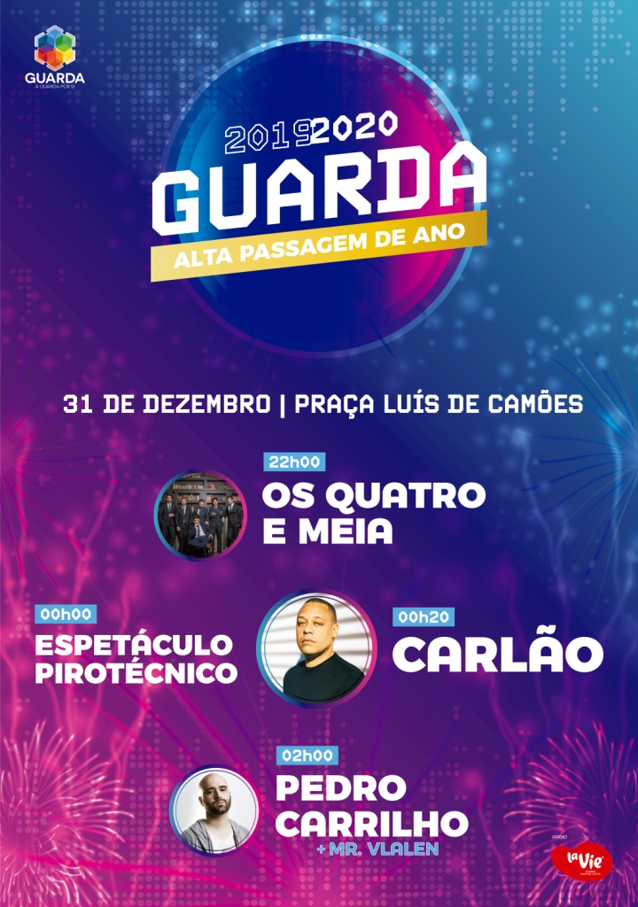 A Guarda vai receber a mais Alta Passagem de Ano do país, com a noite comemorativa tem início pelas 22h00 com o concerto d’ Os Quatro e Meia. Atualmente com seis elementos, Os Quatro e Meia procuram, de uma forma descontraída e bem-disposta, conferir novos olhares e sonoridades na composição de canções feitas na língua de Camões. Trazem consigo os temas do seu primeiro disco: “Pontos nos Is”. E é com Os Quatro e Meia que a Guarda se vai despedir de 2019, seguindo-se, às 00h00 o espetacular Fogo-de-artifício e o brinde coletivo ao novo ano.