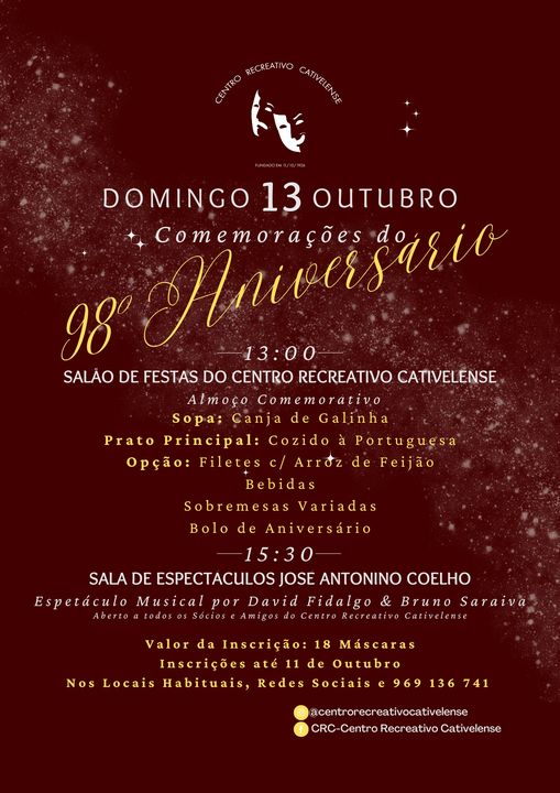 Vai ser assinalado, o 98°aniversário do Centro Recreativo Cativelense, que terá início no dia 13…