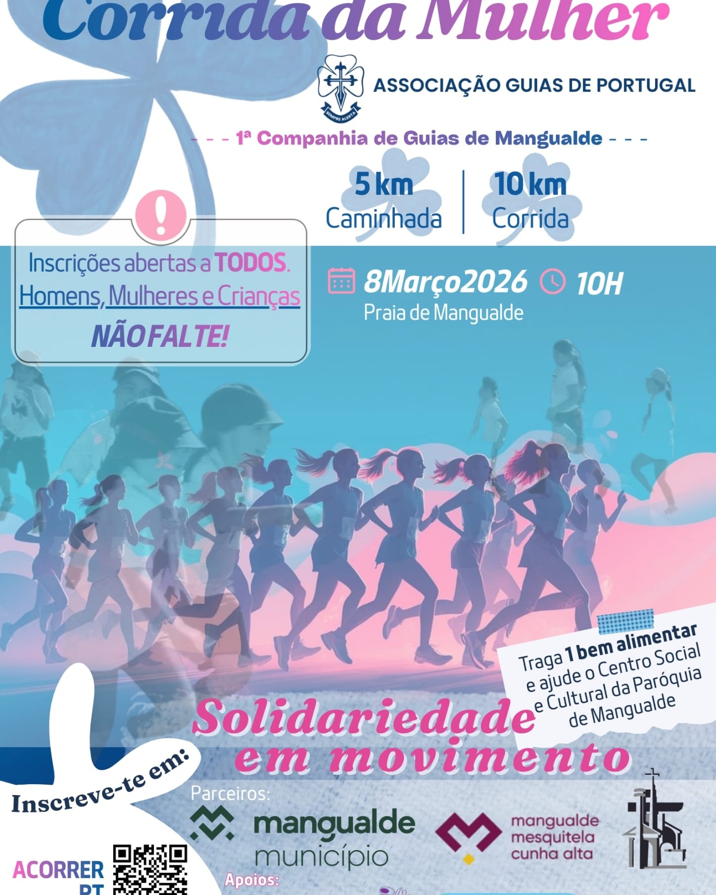 Vai decorrer na cidade de Mangualde, uma corrida e caminhada, numa iniciativa da 1ªCompanhia de Guias de Mangualde no dia 8 de março 2026. Todos os atletas, voluntariamente, podem entregar neste dia um bem alimentar não perecível que será doado ao Centro Social e Cultural da Paróquia de Mangualde. Por cada inscrição, 1€ reverterá também para a aquisição de cadeira(s) de rodas para esta instituição.