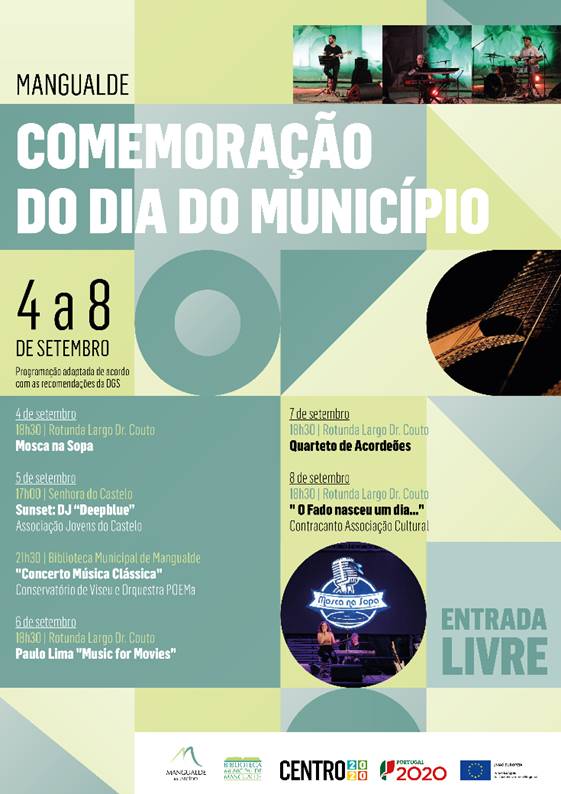 O Município de Mangualde vai levara feito um conjunto de espetáculos no âmbito da comemoração do Dia do Município, que se celebra a 8 de setembro. Estes concertos vão ocorrer no fim de semana de 4 a 8 de setembro na Rotunda Largo Dr. Couto, na Sra. Castelo e na Biblioteca Municipal de Mangualde, a partir das 17h00. Todo o programa foi adaptado por forma a seguir as recomendações de segurança da Direção Geral de Saúde (DGS).