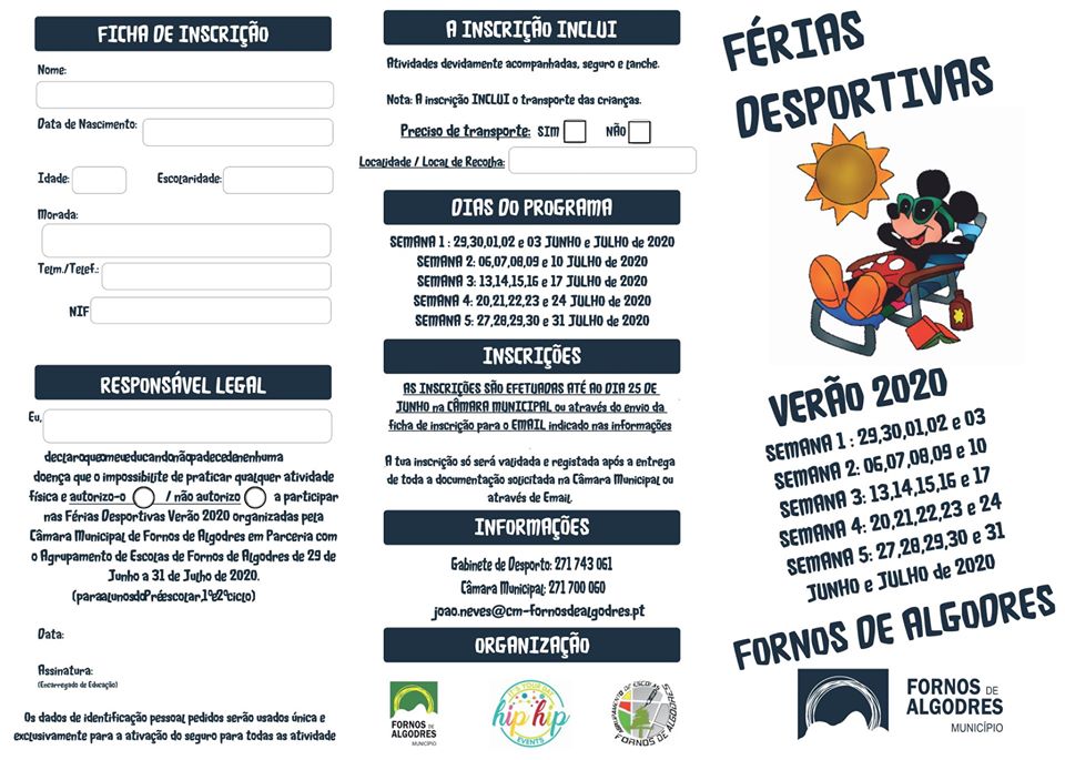 Apesar da pandemia, as Férias Desportivas “Verão 2020” no Município de Fornos de Algodres vão realizar-se de 29 de junho a 31 de julho.