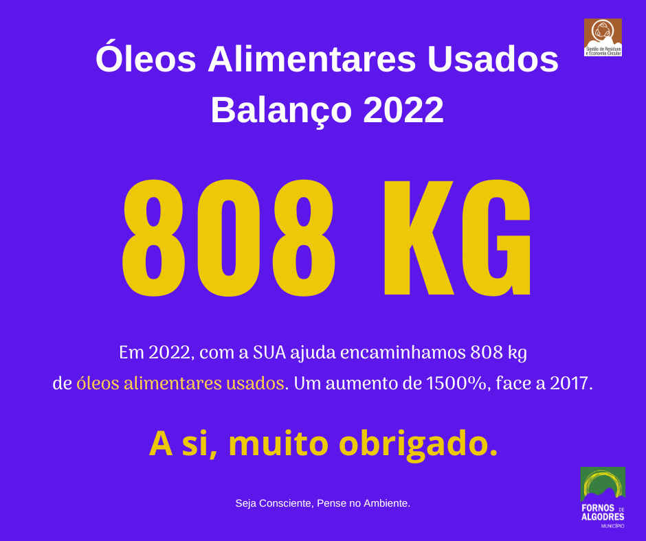 Em 2022, através da empresa certificada “HARDLEVEL – Energias Renováveis, Lda”, com o código APA00430382, foram encaminhados para destino adequado e licenciado: 808 kg de óleos alimentares usados (OAU). Comparando com o ano de referência (2017) que foram recolhidos 50 kg, estamos a falar de um aumento de mais de 1500%.