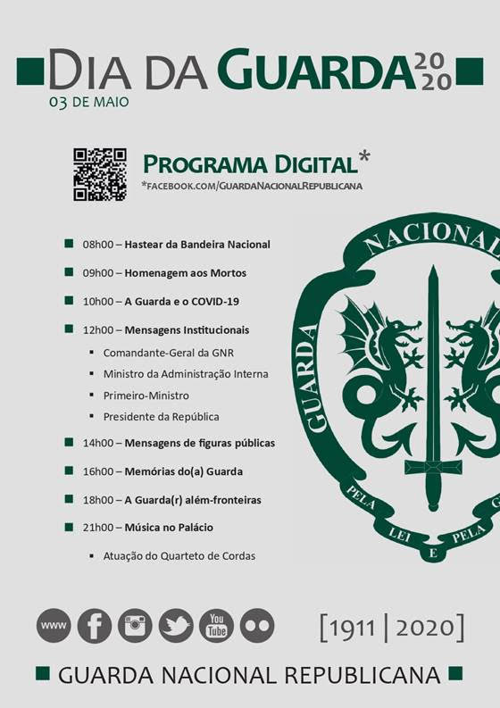 As comemorações do Dia da Guarda serão transmitidas ao longo do dia 3 de maio, na página oficial de Facebook da GNR https://www.facebook.com/GuardaNacionalRepublicana/