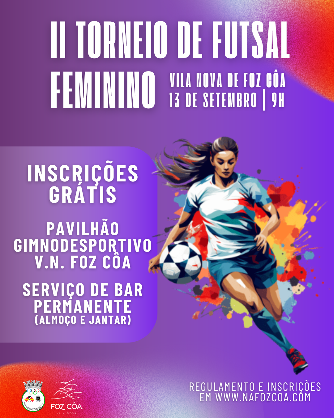 O Núcleo de Árbitros de Vila Nova de Foz Côa, irá realizar, no dia 13 de setembro, o II TORNEIO DE FUTSAL FEMININO, no Pavilhão Gimnodesportivo de Vila Nova de Foz Côa.