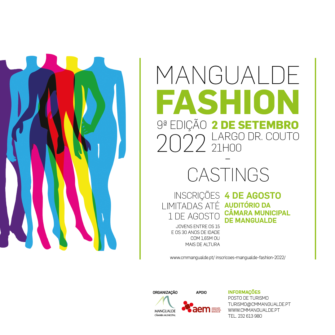 Assim, o casting para a escolha dos manequins que irão desfilar terá lugar no próximo dia 4 de agosto, no auditório da Câmara Municipal de Mangualde. O «Mangualde Fashion» destina-se a jovens entre os 15 e os 30 anos de idade, com 1,65m ou mais de altura e com gosto pela moda. As inscrições para a participação nesta iniciativa são limitadas e devem ser efetuadas até ao dia 1 de agosto, através dos seguintes contactos: Posto de Turismo, turismo@cmmangualde.pt e T. 232 613 980. Pode ser ainda efetuada inscrição online, através do link https://www.cmmangualde.pt/inscricoes-mangualde-fashion-2022/