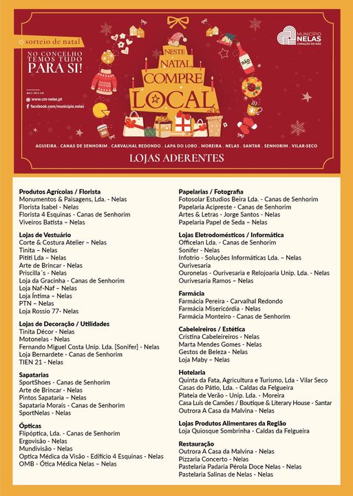 As lojas aderentes encontram-se devidamente identificadas, desde lojas de vestuário, a sapatarias, decoração, produtos agrícolas e floristas, óticas, papelarias, fotografia, eletrodomésticos e informática, ourivesarias, farmácias, cabeleireiros e estética, que esperam por si nesta quadra festiva e que damos a conhecer.