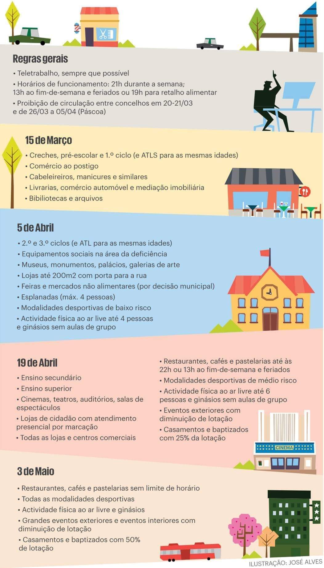 Foi assim aprovado em Conselho de Ministros realizado na passada quinta-feira o decreto que regulamenta o estado de emergência decretado pelo Presidente da República.Prosseguindo a estratégia gradual de levantamento de medidas de confinamento no âmbito do combate à pandemia da doença Covid-19, e tendo em conta a avaliação dos critérios epidemiológicos de definição de controle da pandemia, foi decidida a reabertura, no próximo dia 5 de abril, das seguintes atividades: