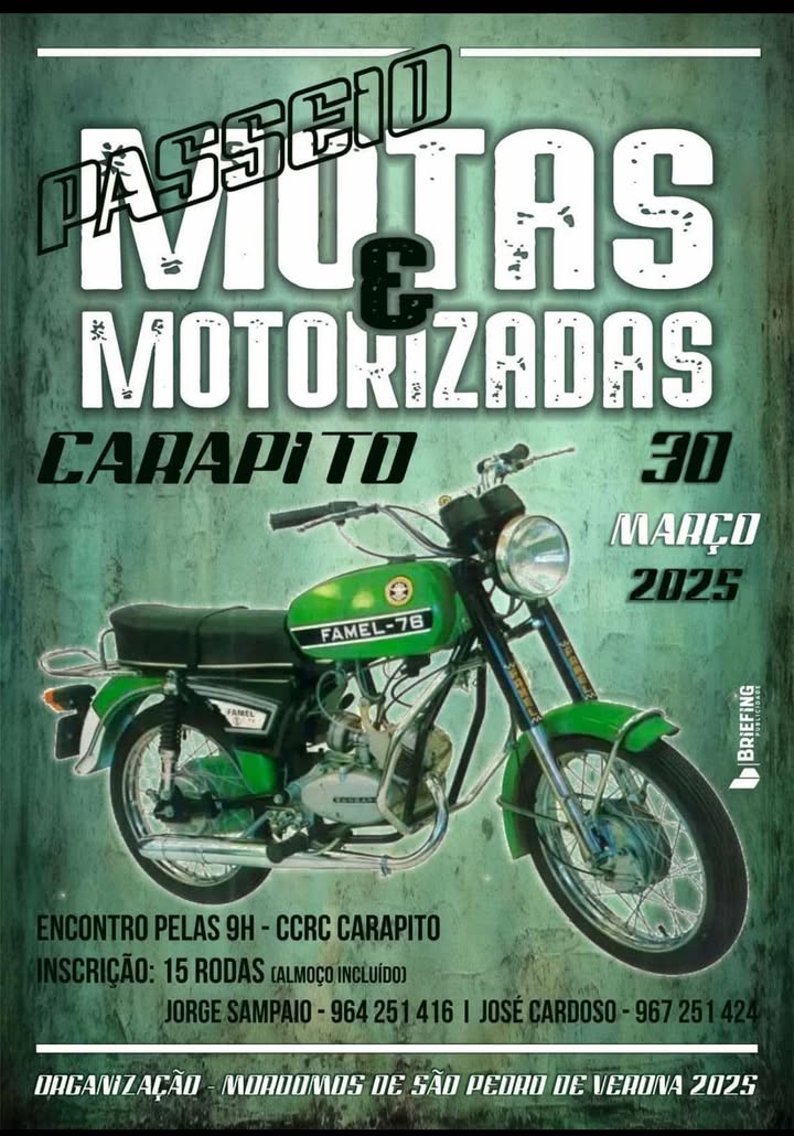 Vai decorrer na localidade de Carapito, concelho de Aguiar da Beira, um passeio de motas e motorizadas, no domingo, dia 30 de março. A concentração será no CCRC Carapito, pelas 9 horas, numa inscrição disponível de 15 rodas. A organização a cargo da mordomia de S.Pedro de Verona.
