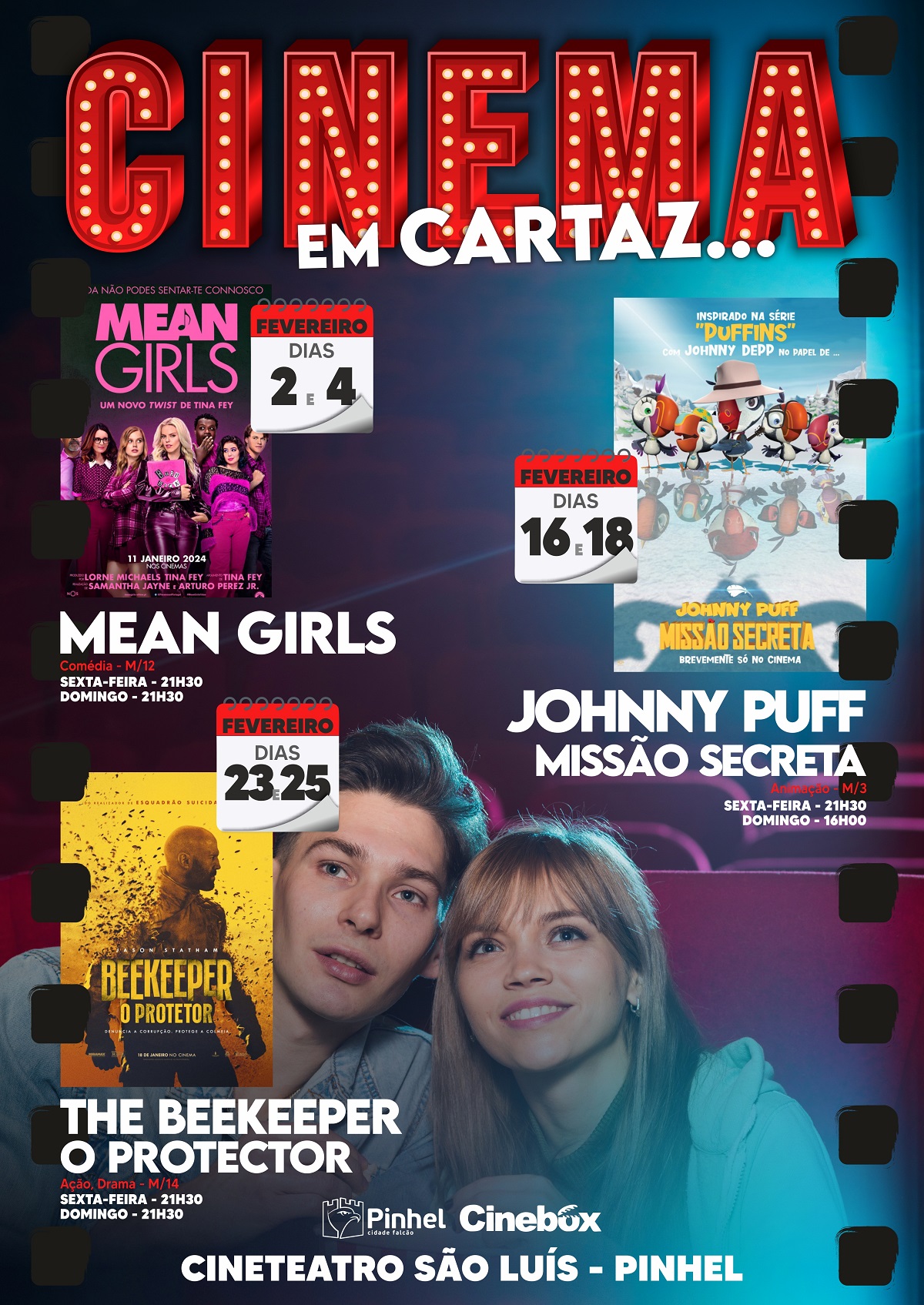 Aqui fica a programação de cinema agendada para o mês de fevereiro, sendo os filmes exibidos no Cineteatro São Luís, em Pinhel, nos dias e horários abaixo indicados.