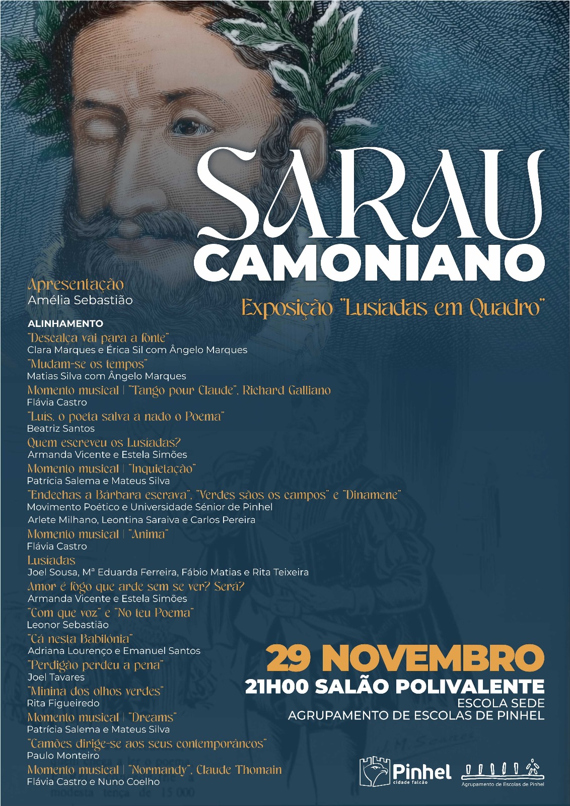 No âmbito das Comemorações dos 500 anos do nascimento de Camões, o Município de Pinhel e o Agrupamento de Escolas de Pinhel, em parceria com o Movimento Poético Pinhelense, a Universidade Sénior e mais alguns convidados, entre os quais artistas locais ligados à música, vão promover um Sarau Camoniano dedicado àquele que é um dos maiores nomes da literatura mundial e cuja obra ocupa, ainda hoje, o lugar cimeiro na história da cultura portuguesa.