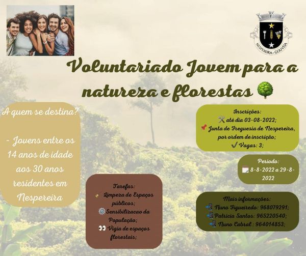 Na localidade de Nespereira vai ter lugar o programa “ Voluntariado Jovem para a natureza e florestas”.Deste modo, as inscrições são limitadas a três jovens, seleção por ordem de inscrição na Junta de Freguesia de Nespereira, até dia 03-08-2022 , com idade mínima 14 anos de idade e máxima 30 anos, residentes em Nespereira .