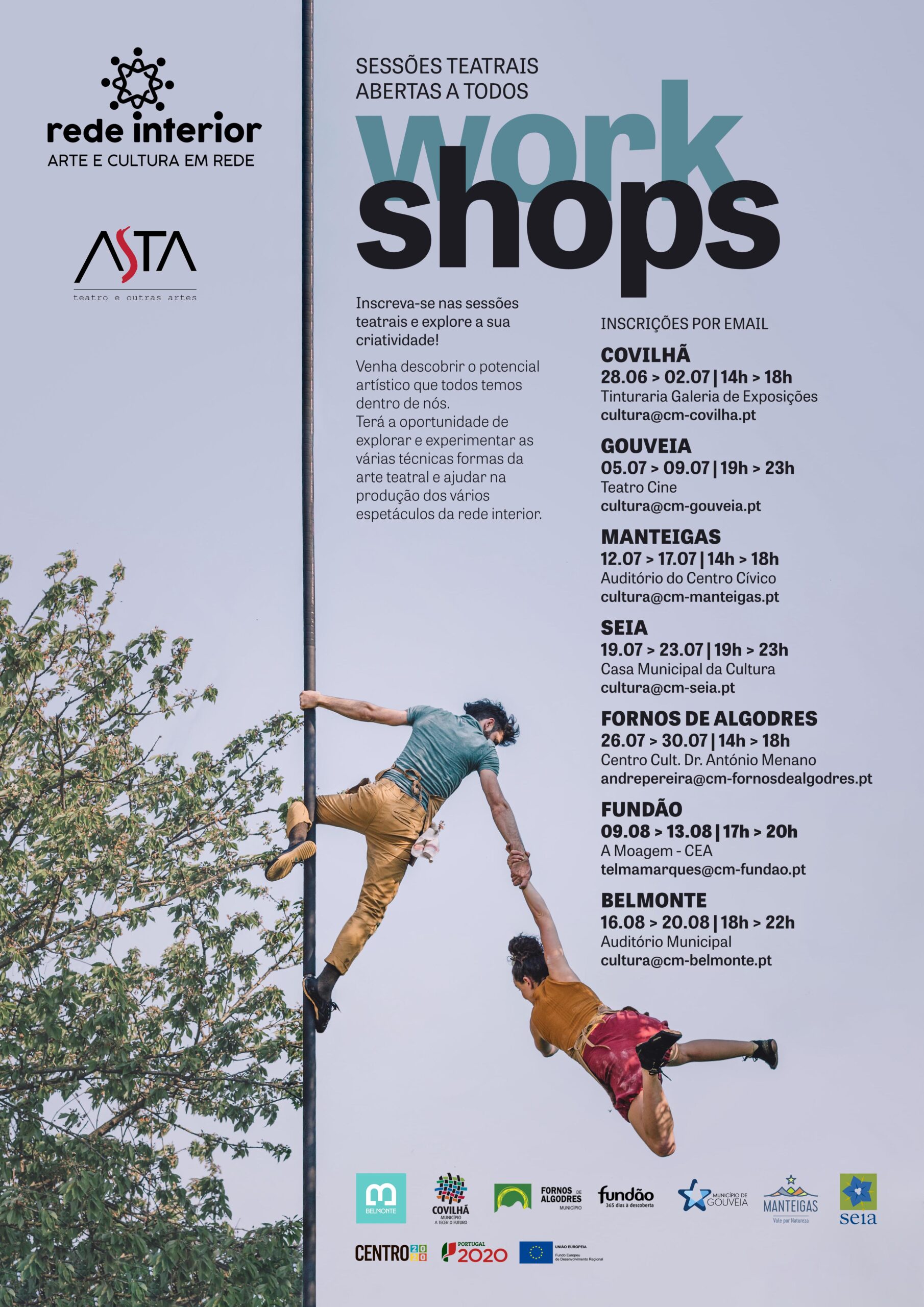 Estão abertas as inscrições para a realização de workshops criativos a todos os que estejam interessados em experimentar novos ‘voos’ na área do teatro e outras artes. Basta enviar um email para o município onde pretende realizar o workshop. Estas ações irão acontecer nos municípios que compõem a Rede Interior – Arte e Cultura em Rede: Belmonte (de 16 a 20 de agosto), Covilhã (28 de junho a 2 de julho), Fornos de Algodres (26 a 30 de julho), Fundão (9 a 13 de agosto), Gouveia (5 a 9 de julho), Manteigas (12 a 17 de julho), Seia (19 a 23 de julho).