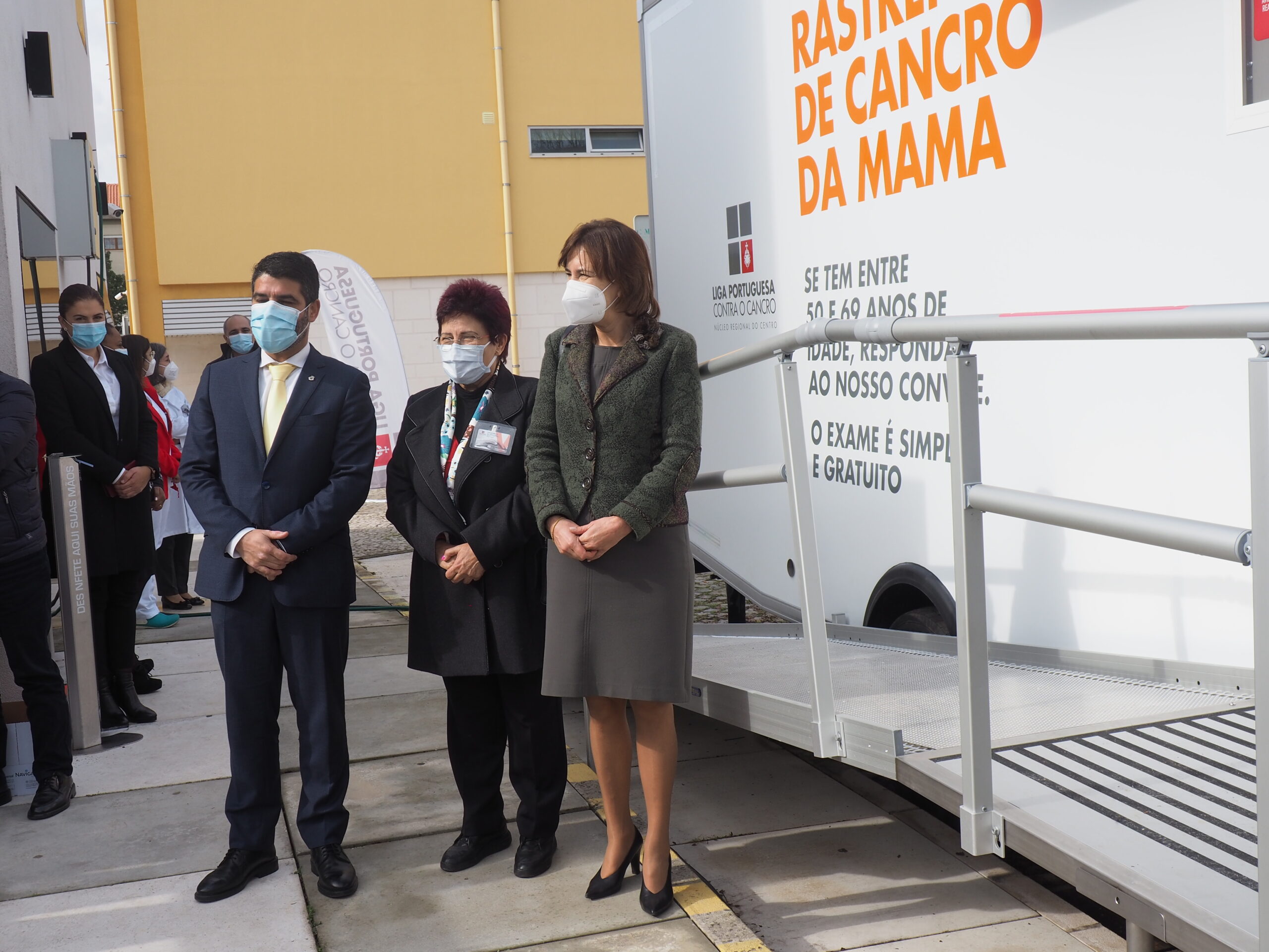 Na cerimónia de apresentação da unidade móvel de rastreio de cancro da mama, que decorreu na sexta-feira no Centro de Saúde de Pombal, estiveram presentes a Dra. Natália Amaral, Secretária-geral da Direção do Núcleo Regional do Centro da Liga Portuguesa Contra o Cancro; em representação da Ministra da Saúde, a Dra. Rosa Reis Marques, Presidente do Conselho Diretivo da Administração Regional de Saúde do Centro; e o Dr. Pedro Pimpão Santos, Presidente da Câmara Municipal de Pombal.