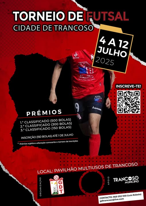 Vai ter lugar, mais uma edição do Torneio de Futsal Cidade de Trancoso , no Pavilhão Multiusos, de 4 a 12 de julho.Assim, numa iniciativa do Grupo Desportivo de Trancoso, deixam o desafio a todas as equipas que queiram participar, podem inscrever-se.
