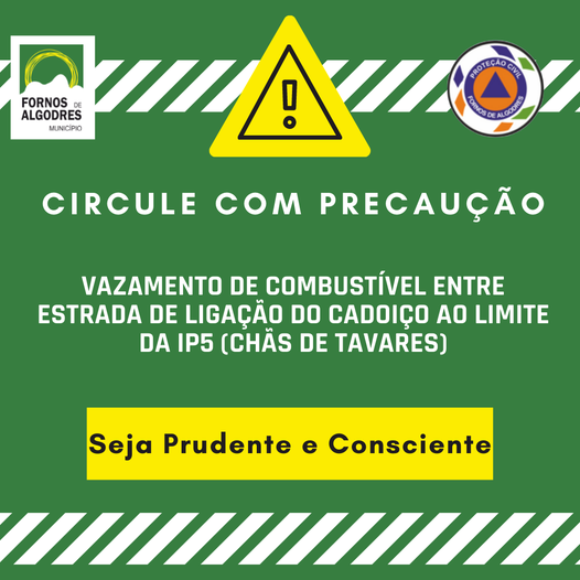 O Serviço Municipal de Proteção Civil de Fornos de Algodres apela a que a circulação nas estradas que ligam a localidade de Cadoiço a Chãs de Tavares (via antiga IP5) seja feito com o máximo cuidado.Detetámos durante a tarde de hoje, um derrame de combustível em mais de 8 km de estrada, na ligação entre estas duas localidades. Já procedemos a uma primeira intervenção de toda a estrada afetada, contudo devido às atuais condições climatéricas, apelamos a que a circulação seja realizada com especial cuidado.