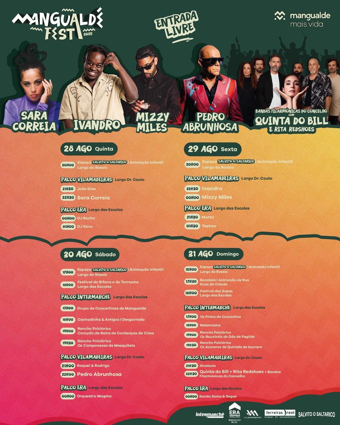 O Mangualde Fest abre esta quinta-feira, dia 28 de agosto. Sara Correia, considerada uma das melhores vozes do fado contemporâneo atua no Palco Vilamadeiras (Largo Dr. Couto) depois de João Dias ( 21h30). Na sexta-feira, o Mangualde Fest abre às 21h30 com Murta, no Palco ERA (Largo das Escolas), seguindo-se Ivandro (22h30) e Mizzy Miles (0h00), no Palco Vilamadeiras e Teetwo (1h30) no Palco Era.