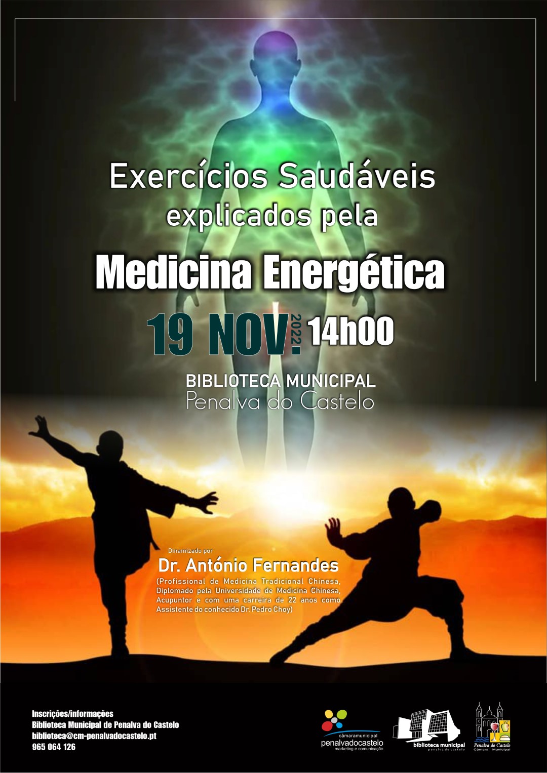 315470792_511221901054532_5563180293627353187_n-212x300 Workshop “Exercícios Saudáveis explicados pela Medicina Energética”No próximo sábado, dia 19 de novembro, pelas 14h00, a Biblioteca Municipal de Penalva do Castelo irá acolher o workshop “Exercícios Saudáveis explicados pela Medicina Energética”. A dinamização deste evento estará a cargo do Dr. António Fernandes, profissional de Medicina Tradicional Chinesa, Diplomado pela Universidade de Medicina Chinesa, Acupuntor e com uma carreira de 22 anos como Assistente do conhecido Dr. Pedro Choy.